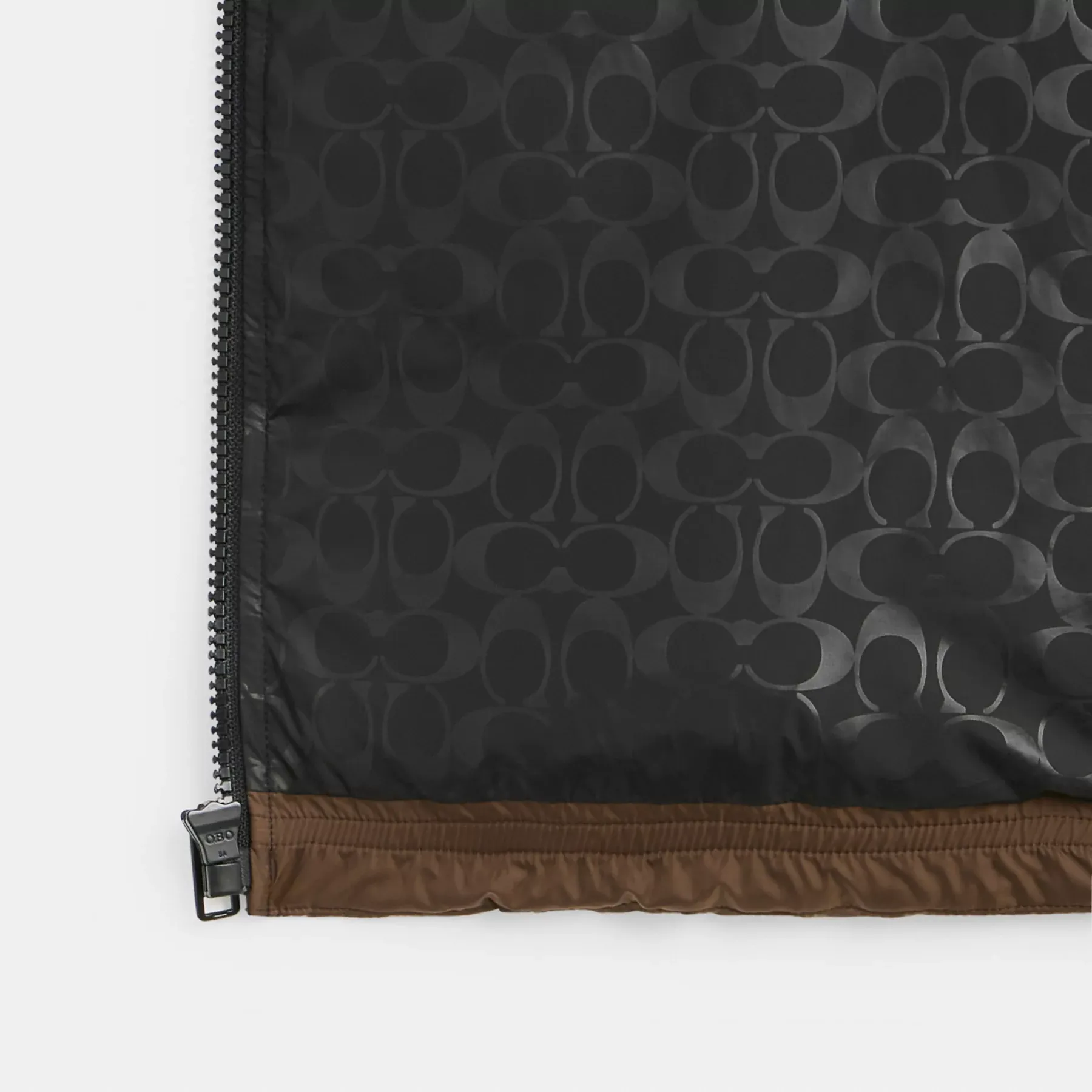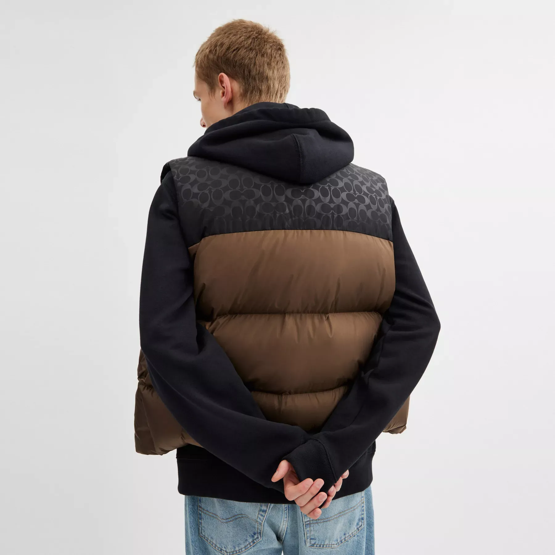 ,Detailed with a tonal Signature yoke for subtle heritage style, this colorblock puffer vest has a lightweight fill and a protective funnel collar for extra warmth. Finished with slip pockets, the zip-front style is crafted of recycled polyester, part of our commitment to rethinking and reducing our impact on the planet.