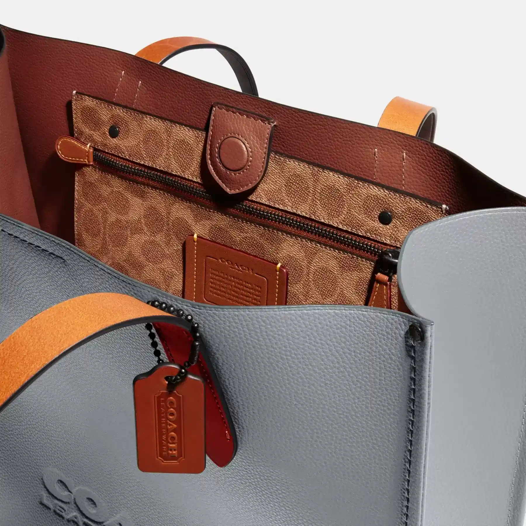 • Polished pebble leather, waxy vegetable leather and Signature coated canvas