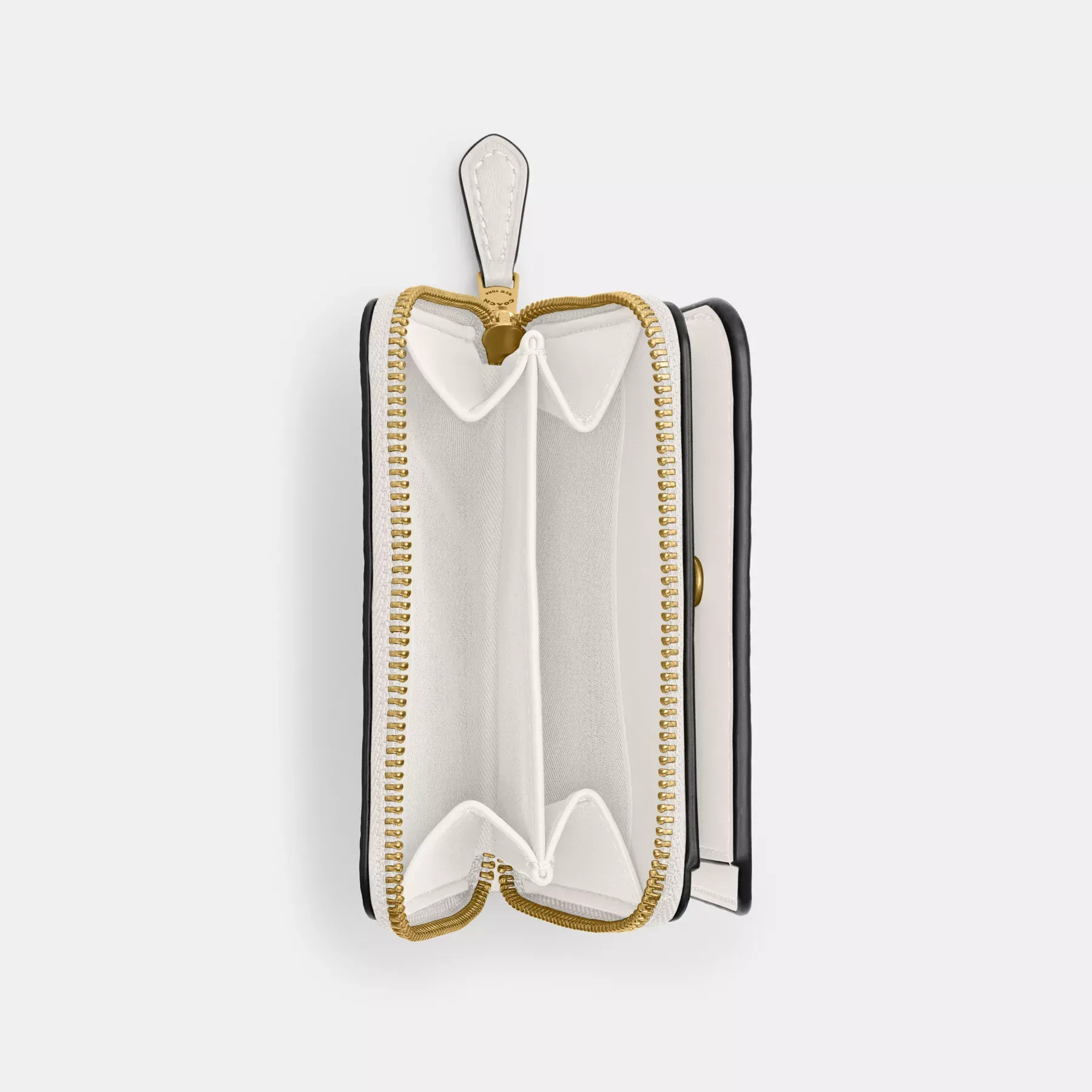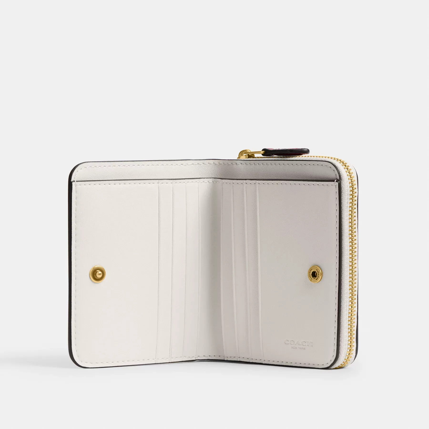 Crafted of polished pebble leather printed with a cheerful cherry print detailed with glittery accents for a touch of sparkle, this compact billfold wallet features a convenient exterior zip pocket for coins, receipts, earbuds and other small essentials. It unsnaps to reveal eight card slots and a full-length bill compartment.