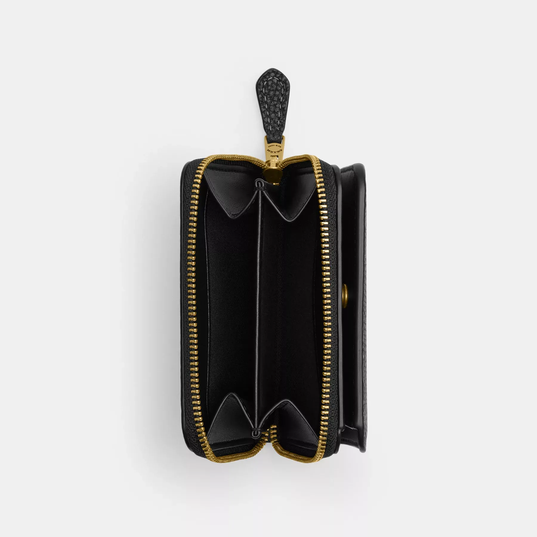 Featuring Coach mascot Rexy front and center, this compact polished pebble leather billfold wallet features a convenient exterior zip pocket for coins, receipts, earbuds and other small essentials. It unsnaps to reveal eight card slots and a full-length bill compartment.