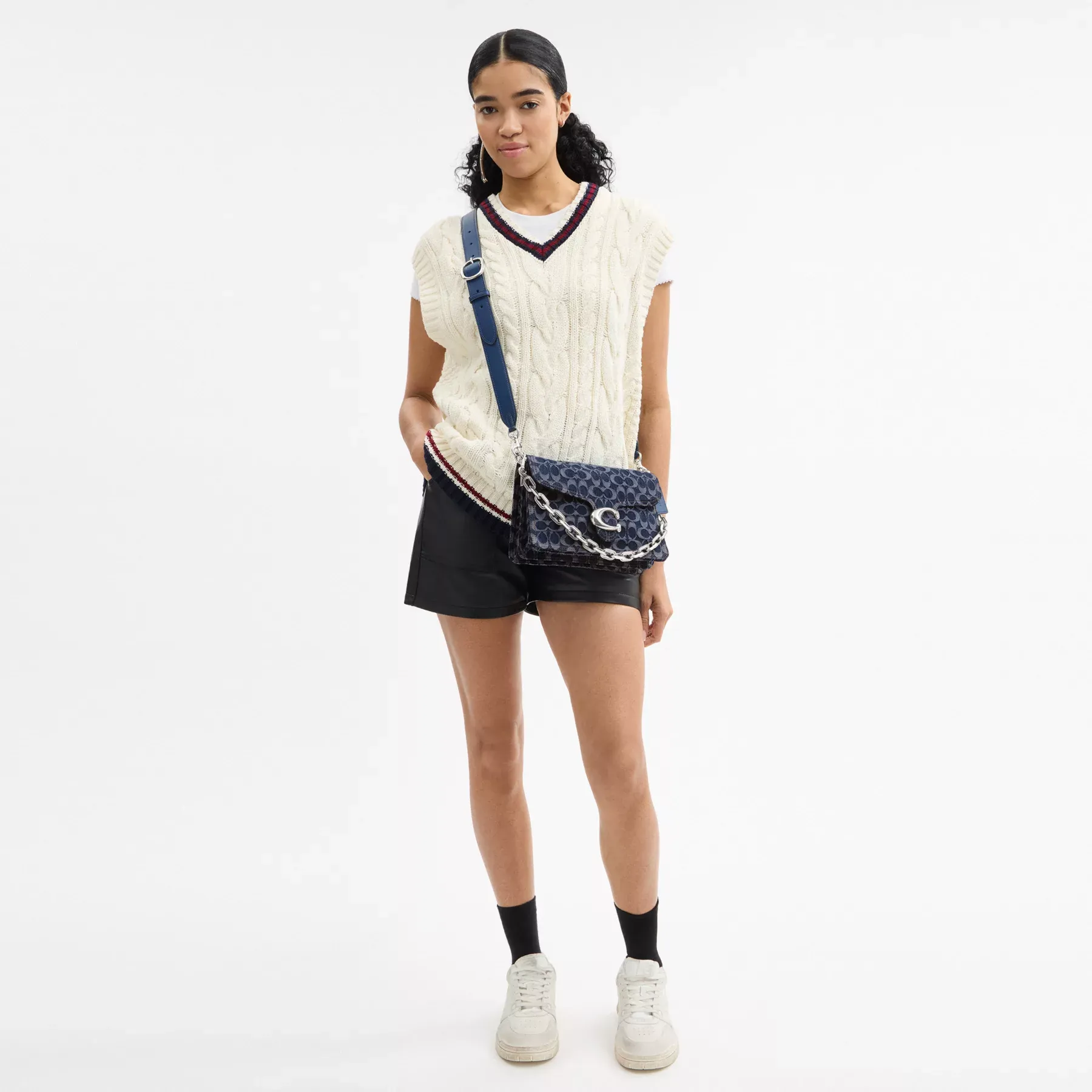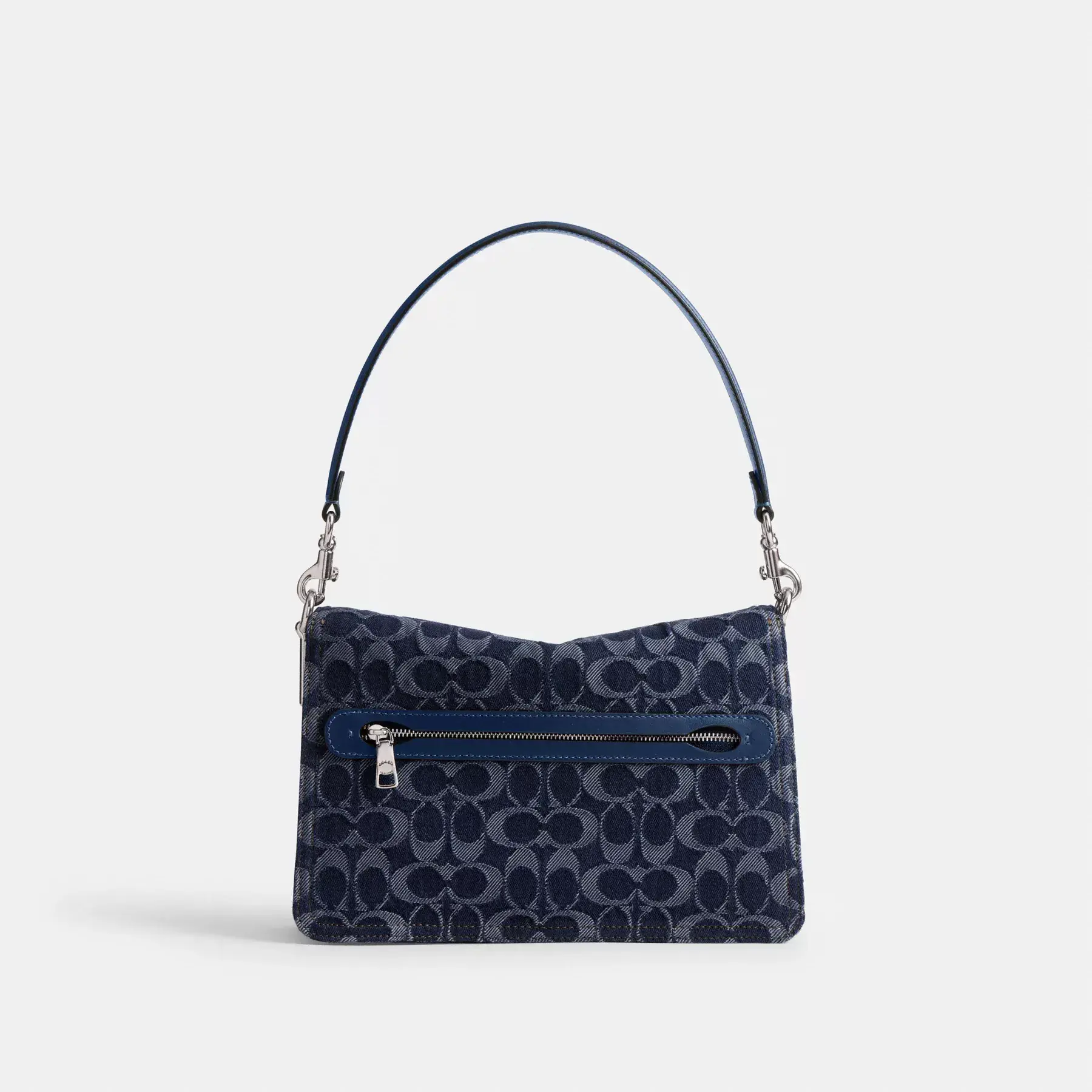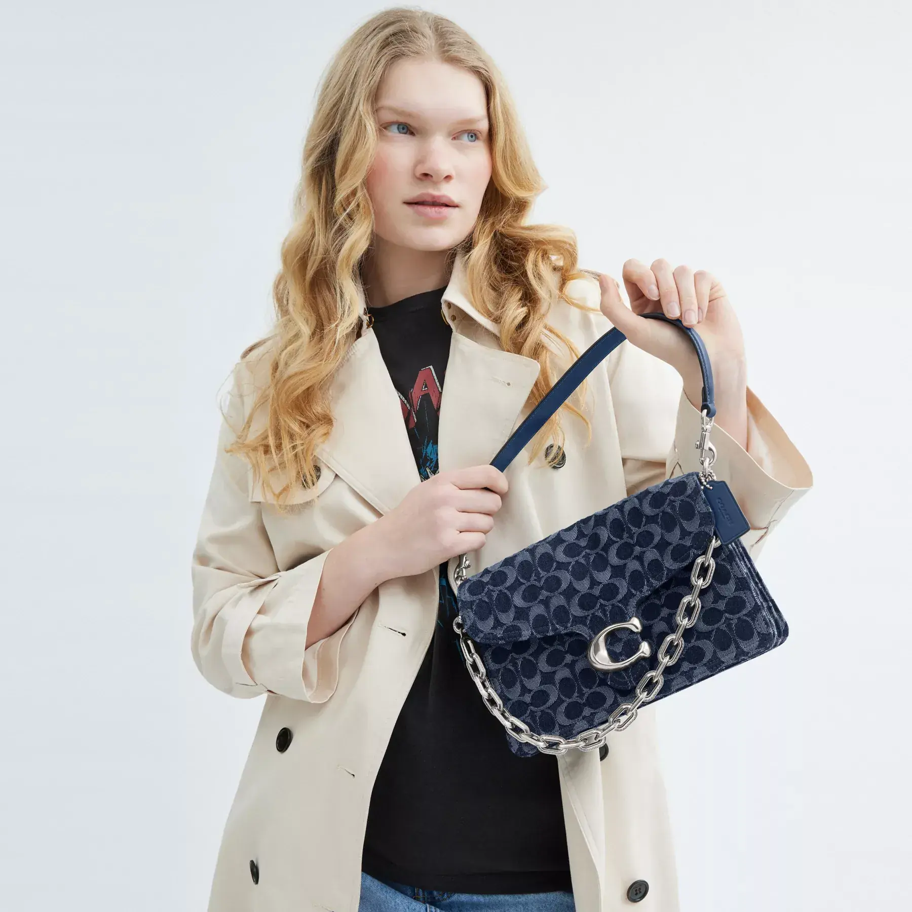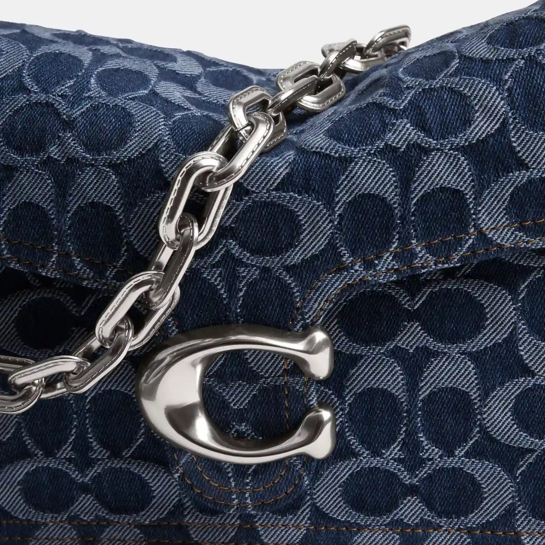 A modern take on an archival 1970s Coach design, our structured Signature denim Chain Tabby shoulder bag is detailed with refined leather trim. Finished with our Signature hardware for an iconic touch, the compact style has space for all the essentials, inside multifunction organizational pockets and a convenient outside zip pocket for easy access items. The versatile design features three detachable straps to carry by hand, wear snug on the shoulder with the elegant stitched chain-link strap and short leather strap or go hands-free with the long leather crossbody strap.