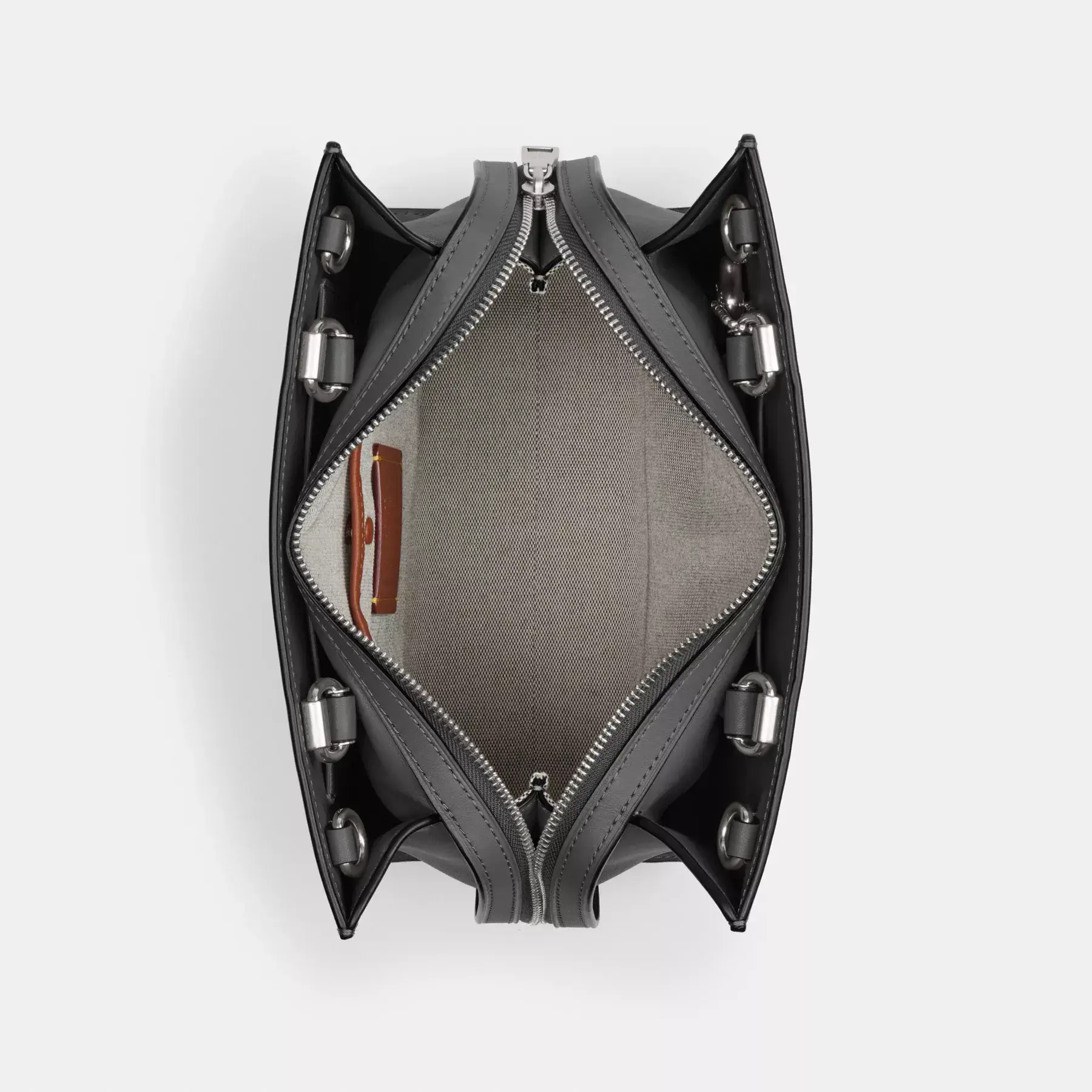 - Zip closure, leather and fabric lining
