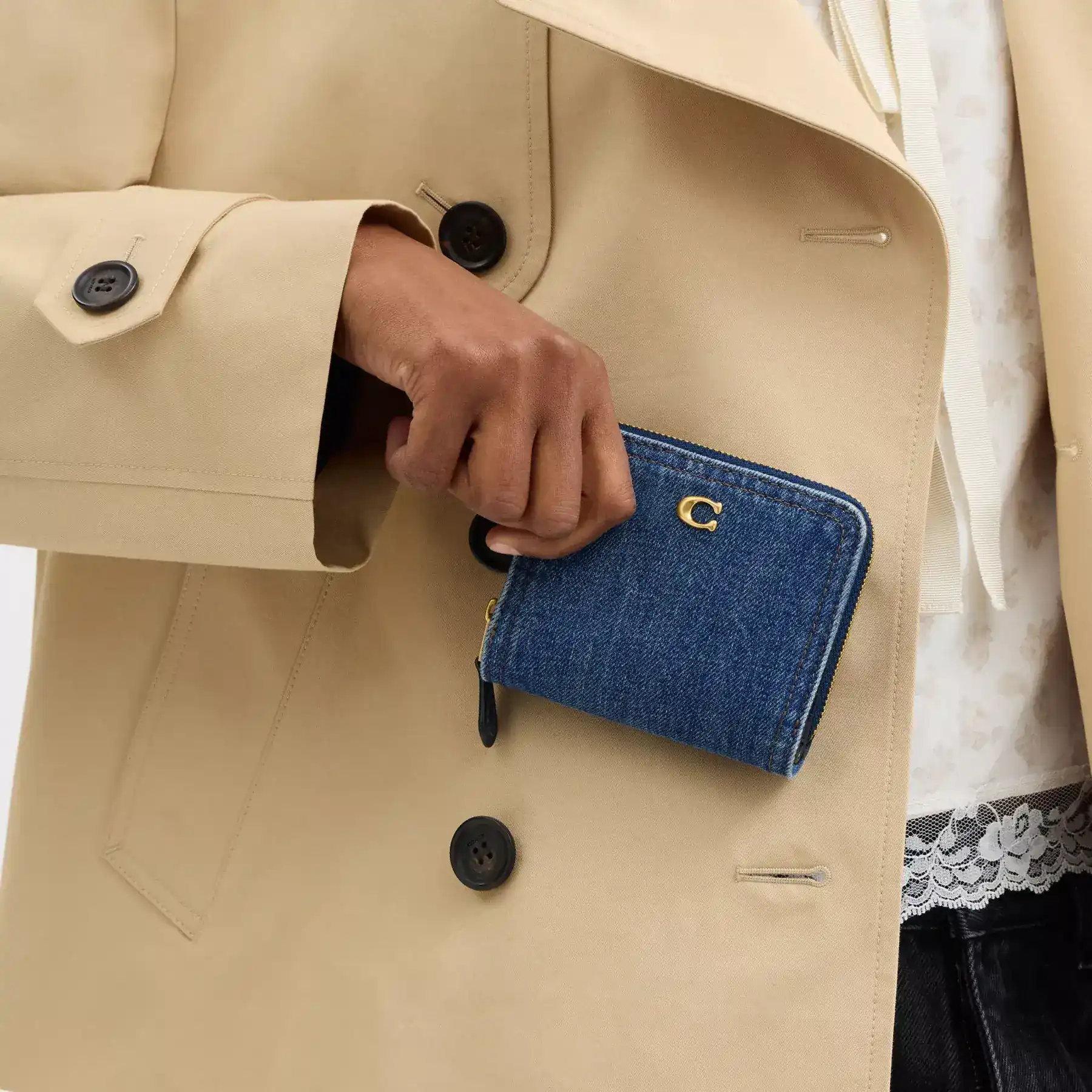 Detailed with contrast stitching and our Signature hardware, this compact refined leather and denim billfold wallet features a convenient exterior zip pocket for coins, receipts, earbuds and other small essentials. It unsnaps to reveal eight card slots and a full-length bill compartment.