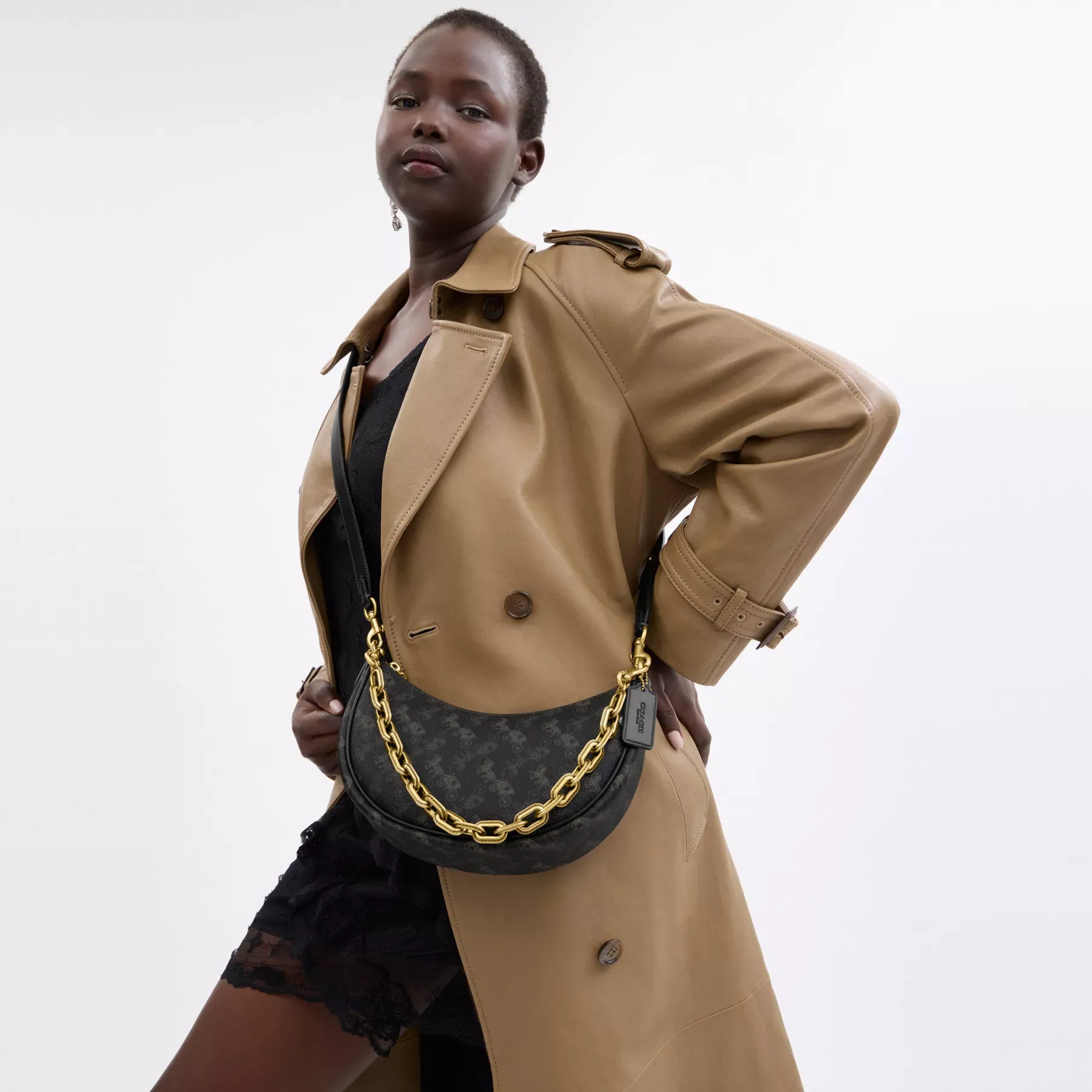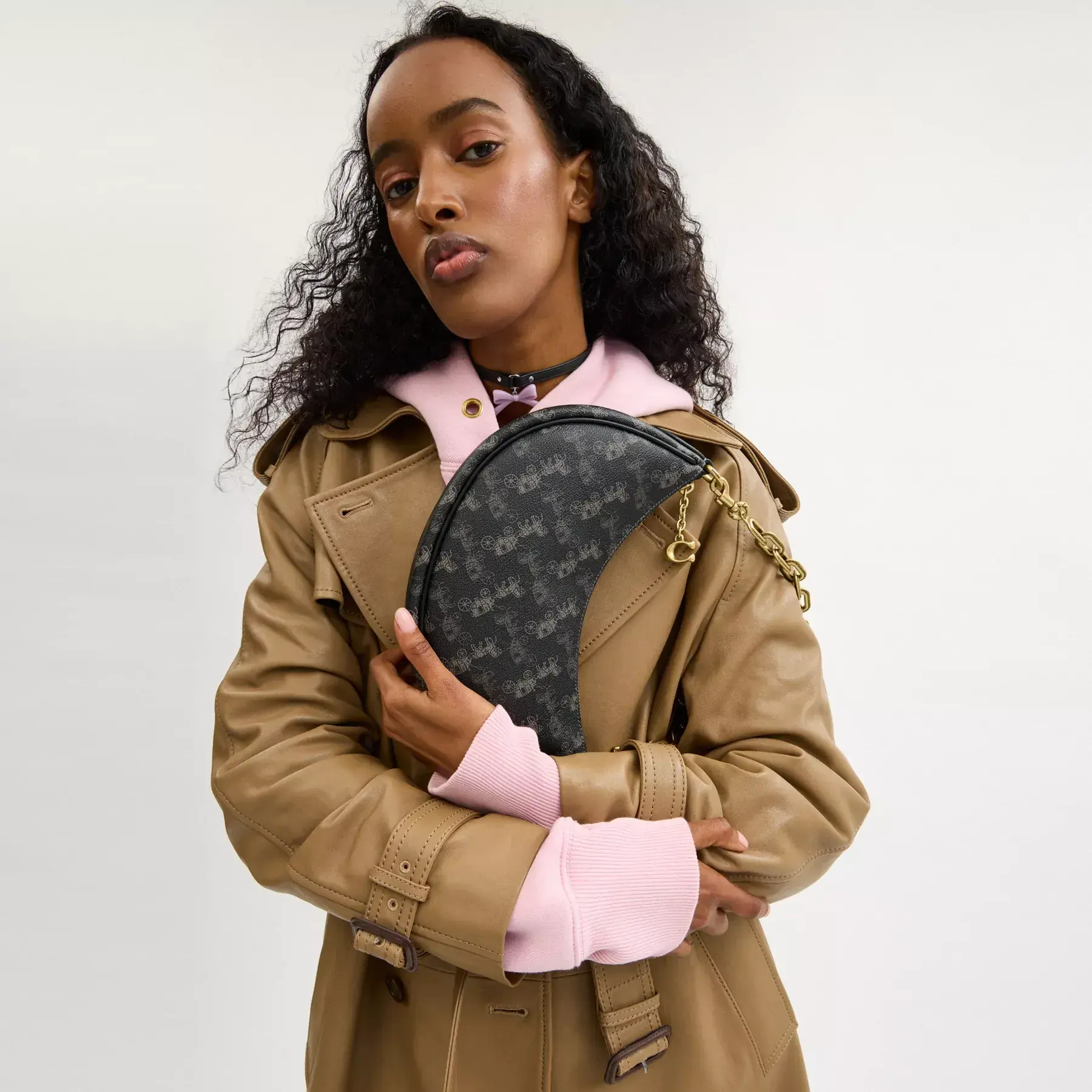 Soft and spacious, our crescent-shaped Mira is ahead of the curve. The versatile style is crafted of refined leather and sturdy coated canvas featuring our iconic Horse and Carriage motif. Finished with a secure zip-top closure detailed with our C hardware, it comes with a chunky chain-link shoulder strap and a detachable leather strap for crossbody wear. (Explore the possibilities.)