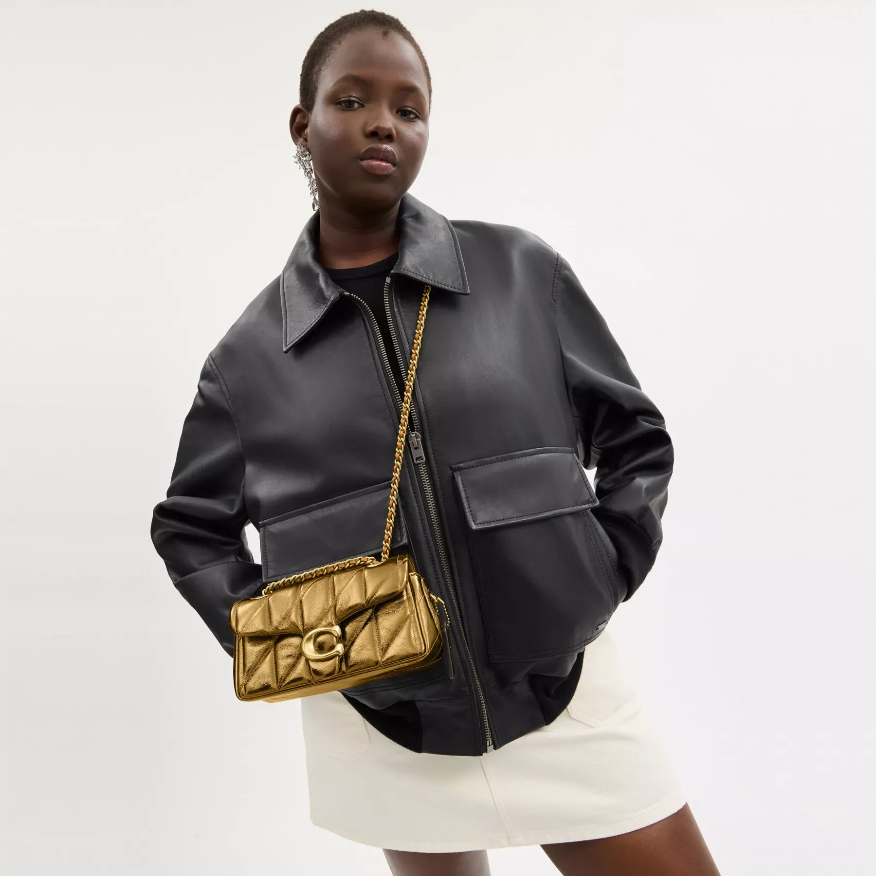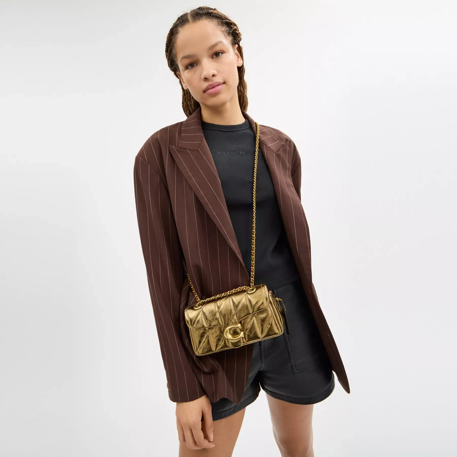 Celebrate 2025 Year of the Snake with our special New Year collection. A modern take on an archival 1970s Coach design, our structured Tabby shoulder bag is crafted of quilted plush textured leather with a brilliant metallic sheen. Slightly smaller than the 26, the petite 20 features a long leather chain strap to wear crossbody or double up for a shorter, dressier look. It’s finished with our polished Signature hardware for an iconic touch.