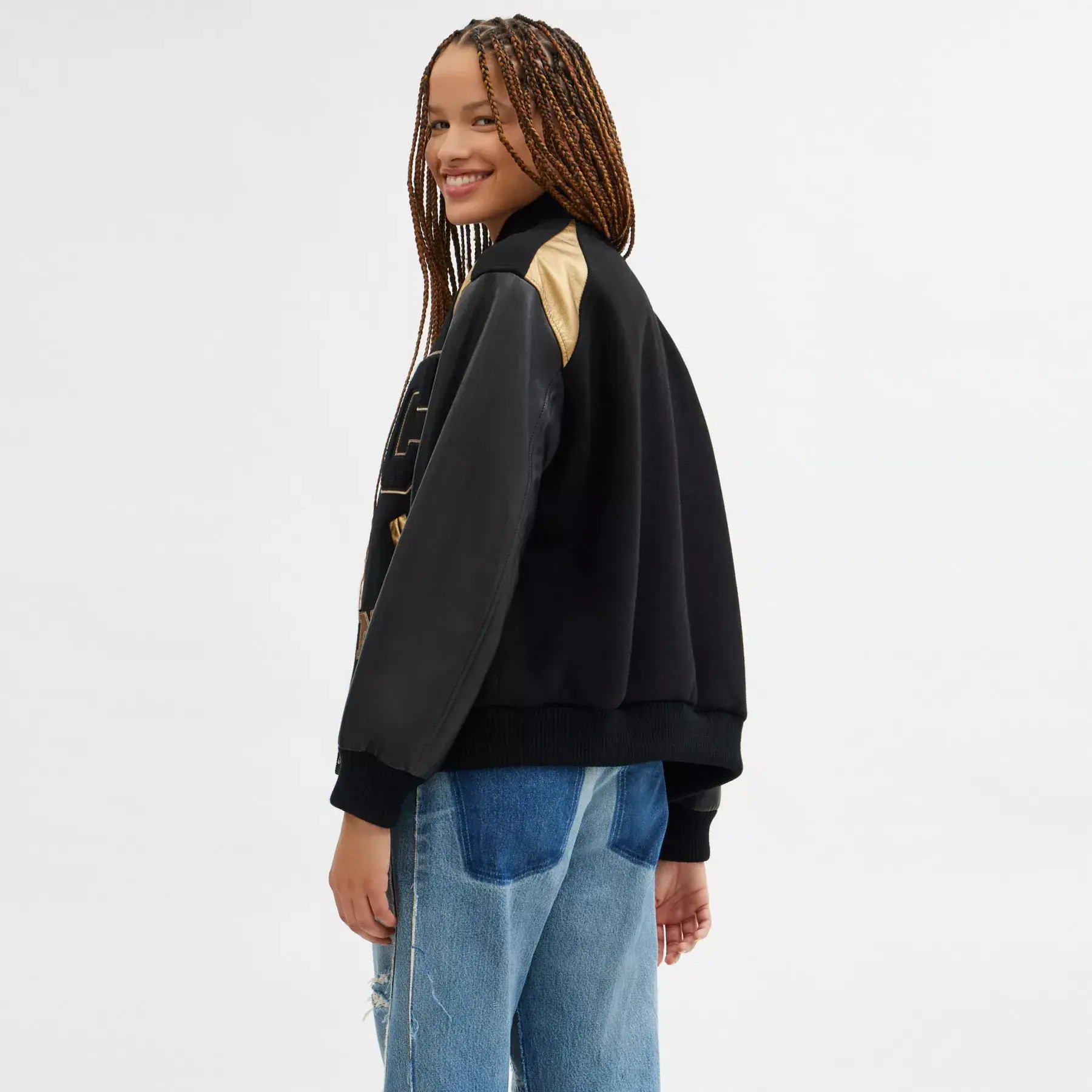 ,Celebrate 2025 Year of the Snake with our special New Year collection. Detailed with pops of metallic gold leather accents, the oversized snap-front Varsity jacket is crafted of a soft wool-blend and smooth leather. Featuring Coach patches and embroidery, the fully lined jacket is finished with slip pockets, ribbed trim and a playful serpent charm on the left pocket.