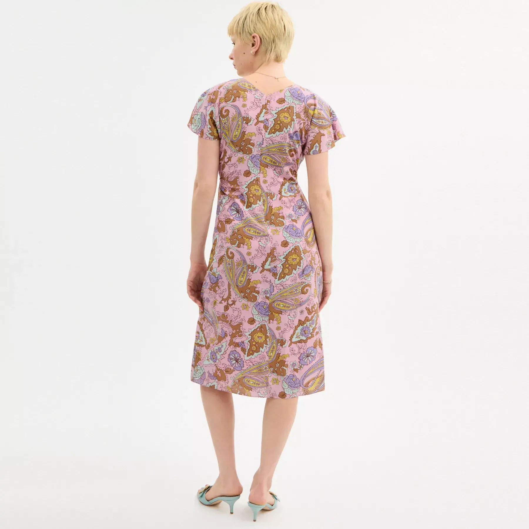,Featuring a refined 1960’s-inspired paisley print, this silk dress is designed with a cascading front ruffle for easy elegance. The V-neck midi-length silhouette is finished with a flutter sleeve cap.