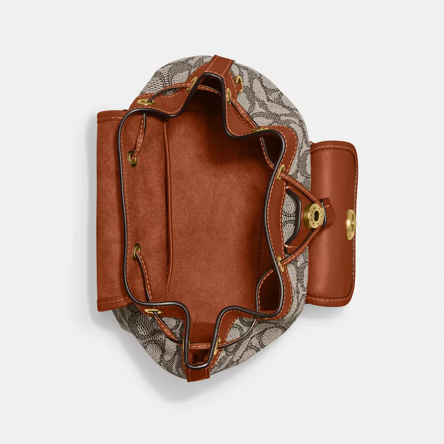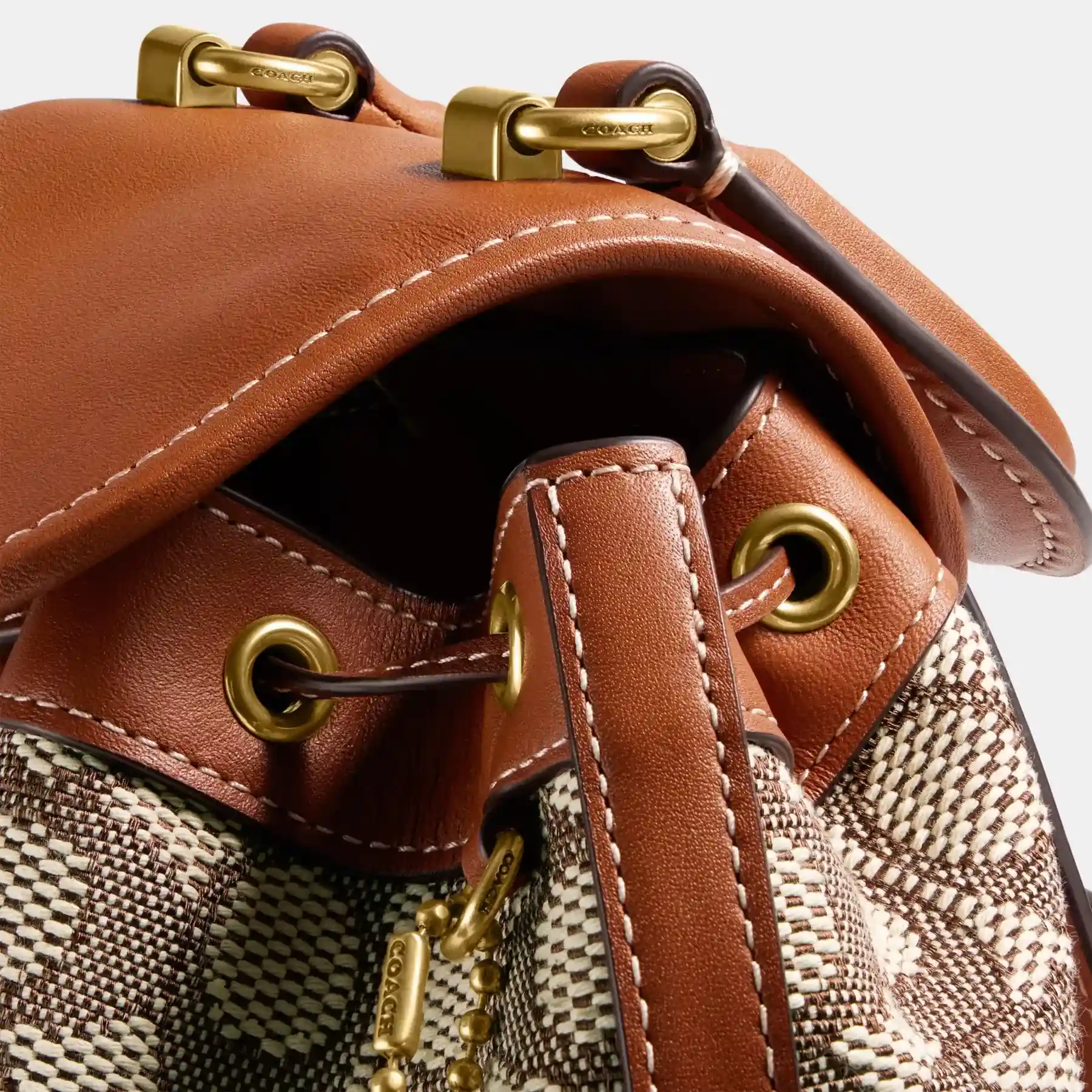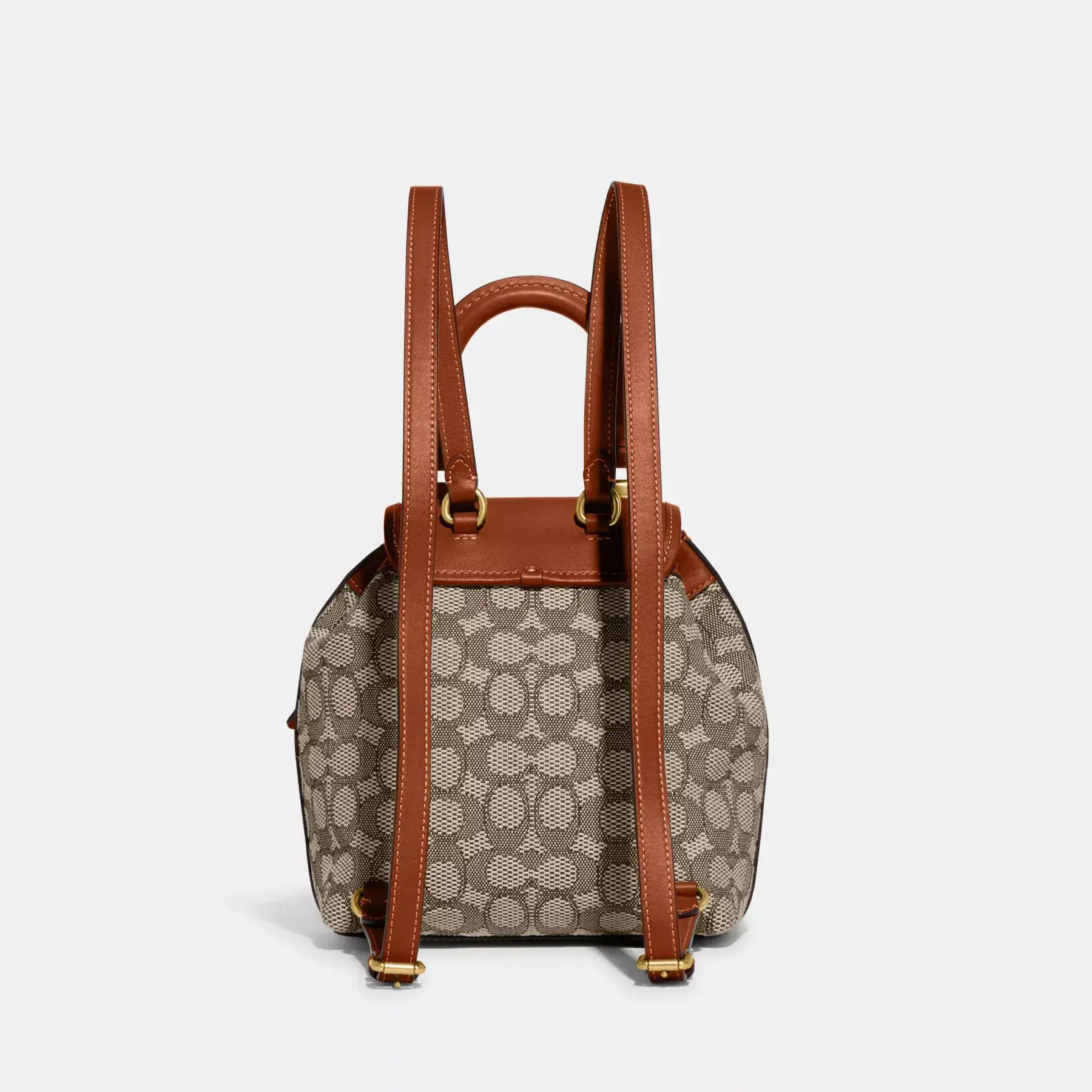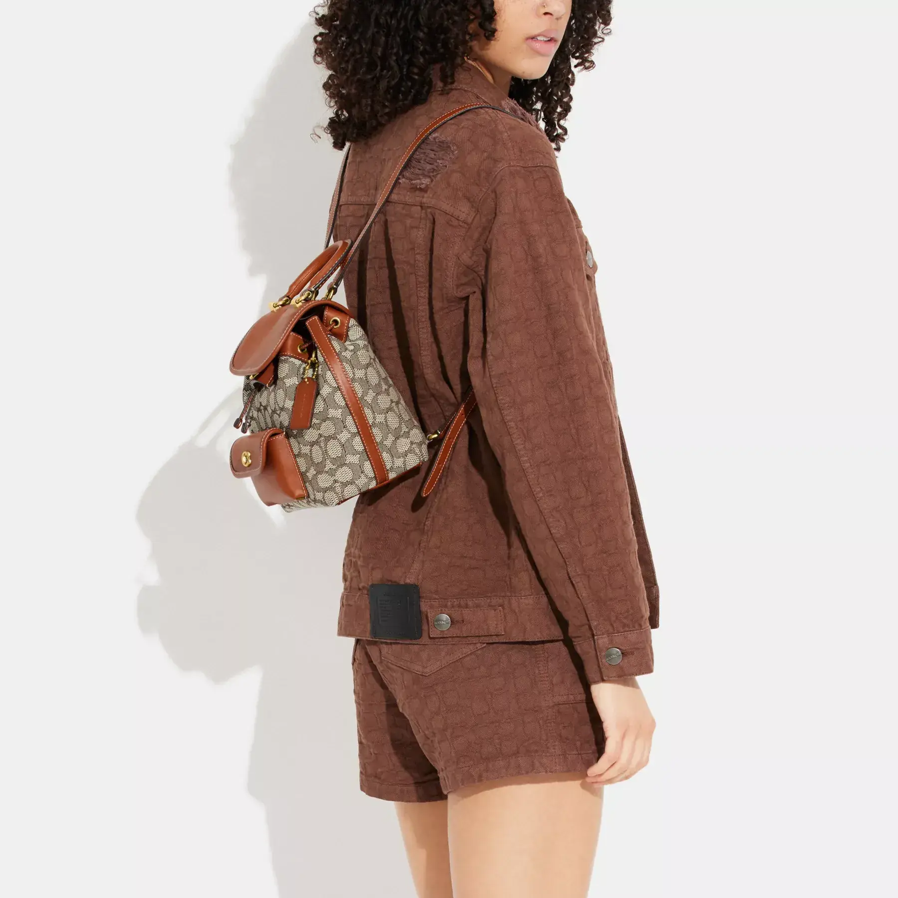 A grown-up take on sporty style, our Riya backpack is a sophisticated, hands-free design. Finished with our Rogue luggage top handle and Signature turnlock closure, the compact 21 is crafted of buttery soft glovetanned leather and our environmentally conscious Signature Textile Jacquard, a material lovingly created in a blend of organic cotton and recycled polyester made from recycled plastic bottles. Featuring a convenient exterior pocket for easy access to essentials, the interior drawstring and snap closure keep belongings secure, while adjustable shoulder straps ensure comfortable, all-day wear. You’ve got plans (and we’ve got your back.)
