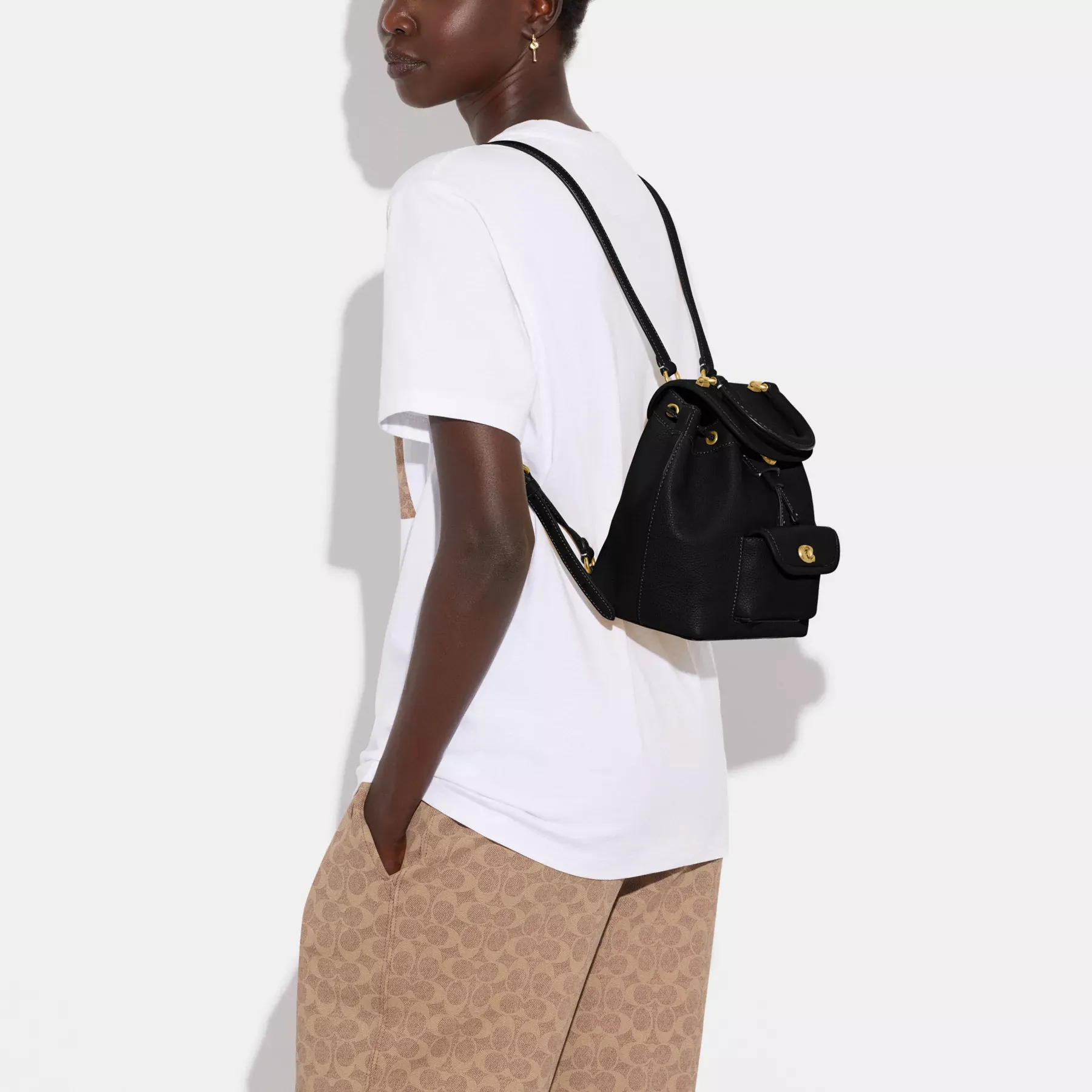 A grown-up take on sporty style, our Riya backpack is a sophisticated, hands-free design. Finished with our Rogue luggage top handle and Signature turnlock closure, the compact 21 is crafted of soft pebble leather with glovetanned leather details and features a convenient exterior pocket for easy access to essentials. The interior drawstring and snap closure keep belongings secure, while adjustable shoulder straps ensure comfortable, all-day wear. You’ve got plans (and we’ve got your back.)