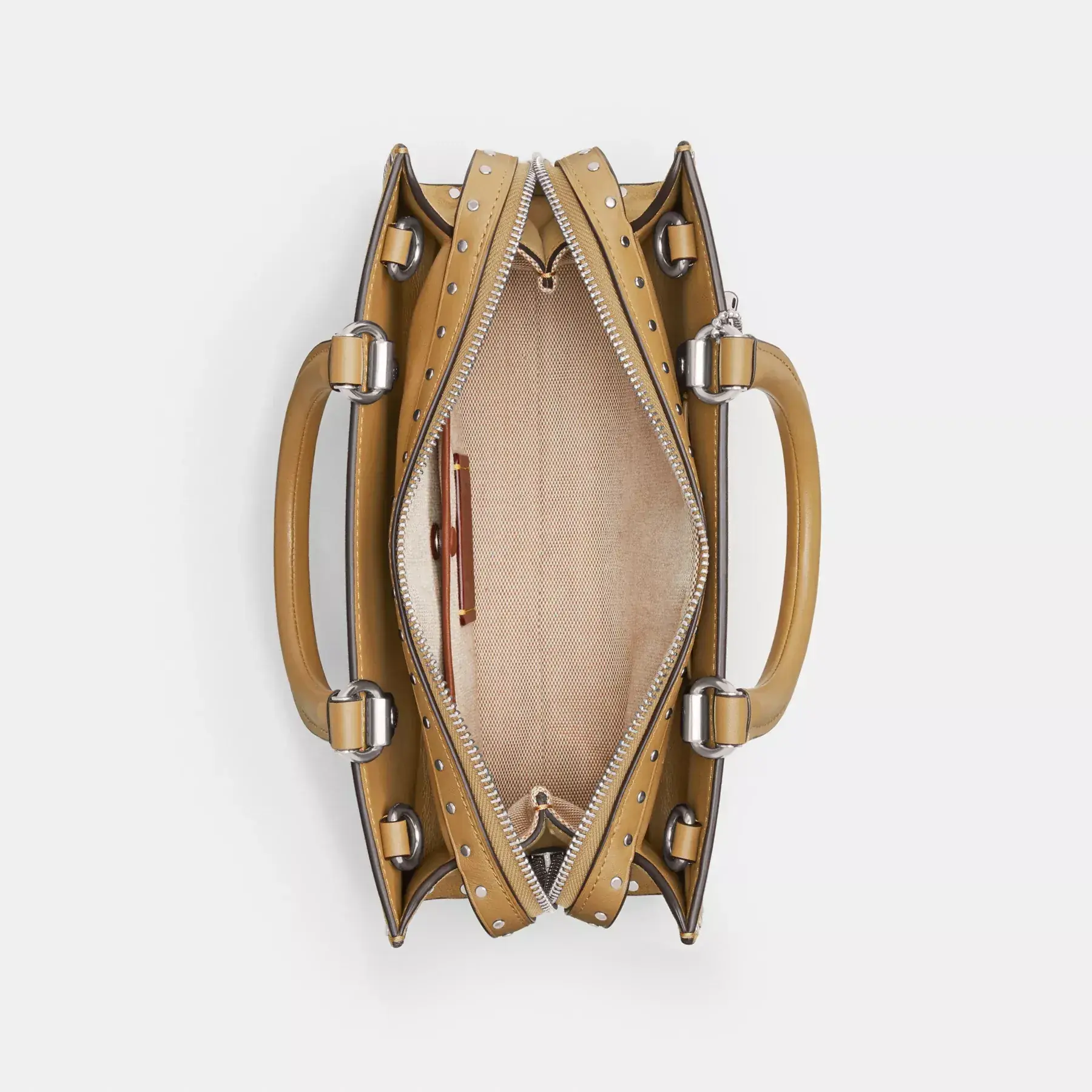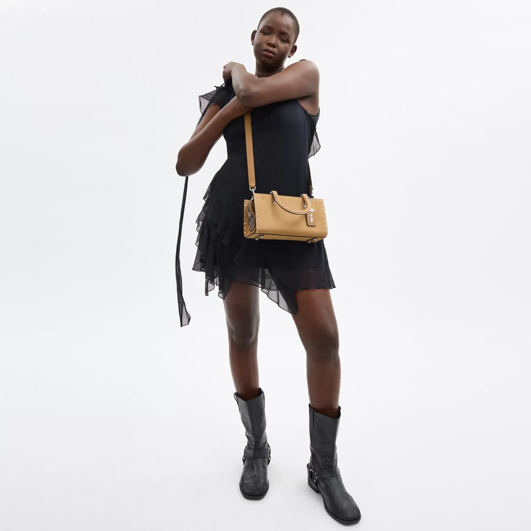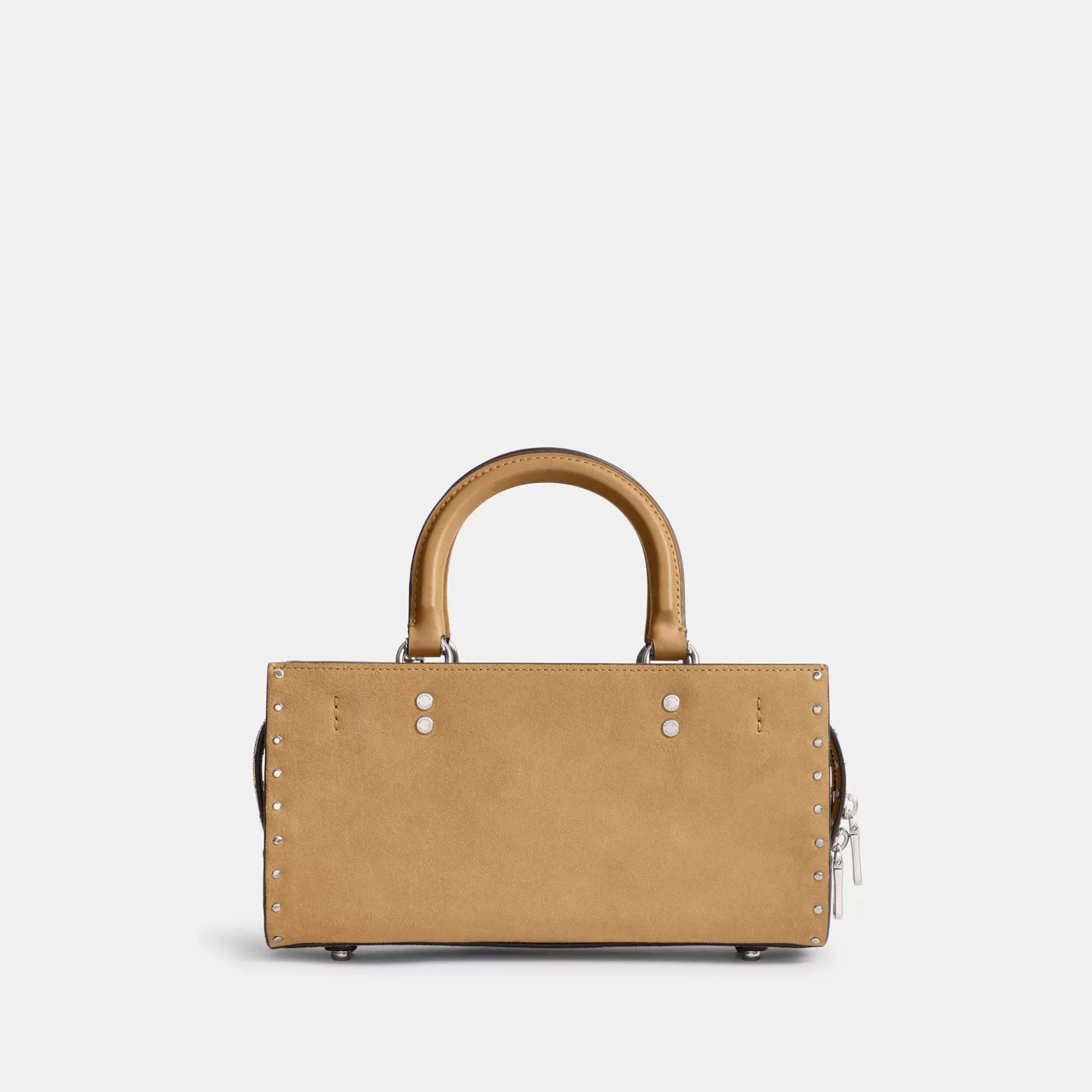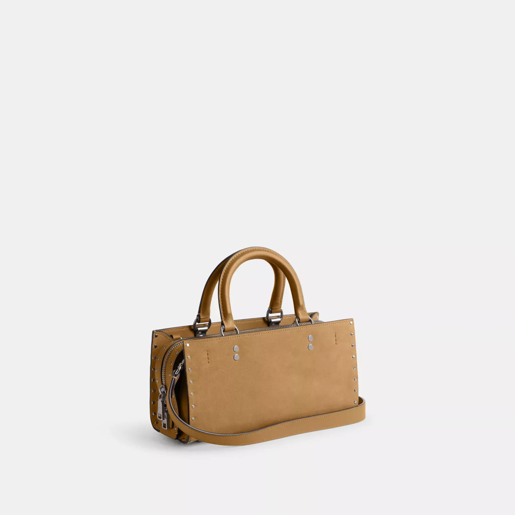 Inspired by free spirits, rebels and dreamers, the aptly named Rogue is a go-anywhere bag. Crafted of our buttery soft glovetanned leather and velvety suede detailed with striking polished rivets, the 26 has an elongated baguette shape perfectly sized for day or night. With space to hold your phone, wallet, keys, and other small essentials, the compact style has two open compartments and a secure center zip compartment. It’s finished with distinctive luggage top handles and detachable straps for shoulder or crossbody wear.