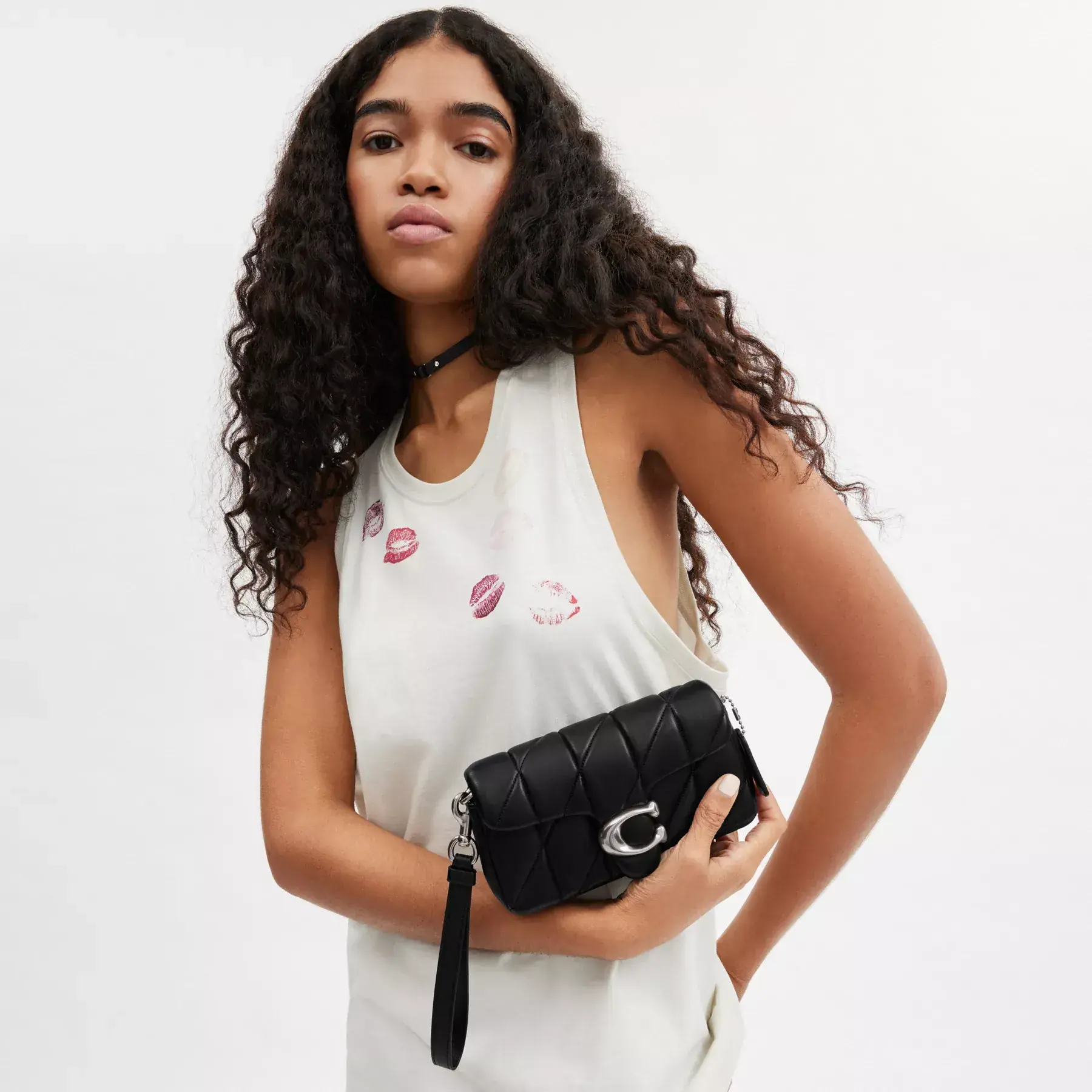A modern take on an archival 1970s Coach design, our Tabby Wristlet is crafted of quilted plush, ultra-soft nappa leather. The versatile style is perfectly sized for cards, cash and a phone with an exterior slip pocket for easy access to essentials. Finished with our Signature hardware for an iconic touch, it can be carried as a wristlet or a clutch and worn crossbody with the elegant chain strap.