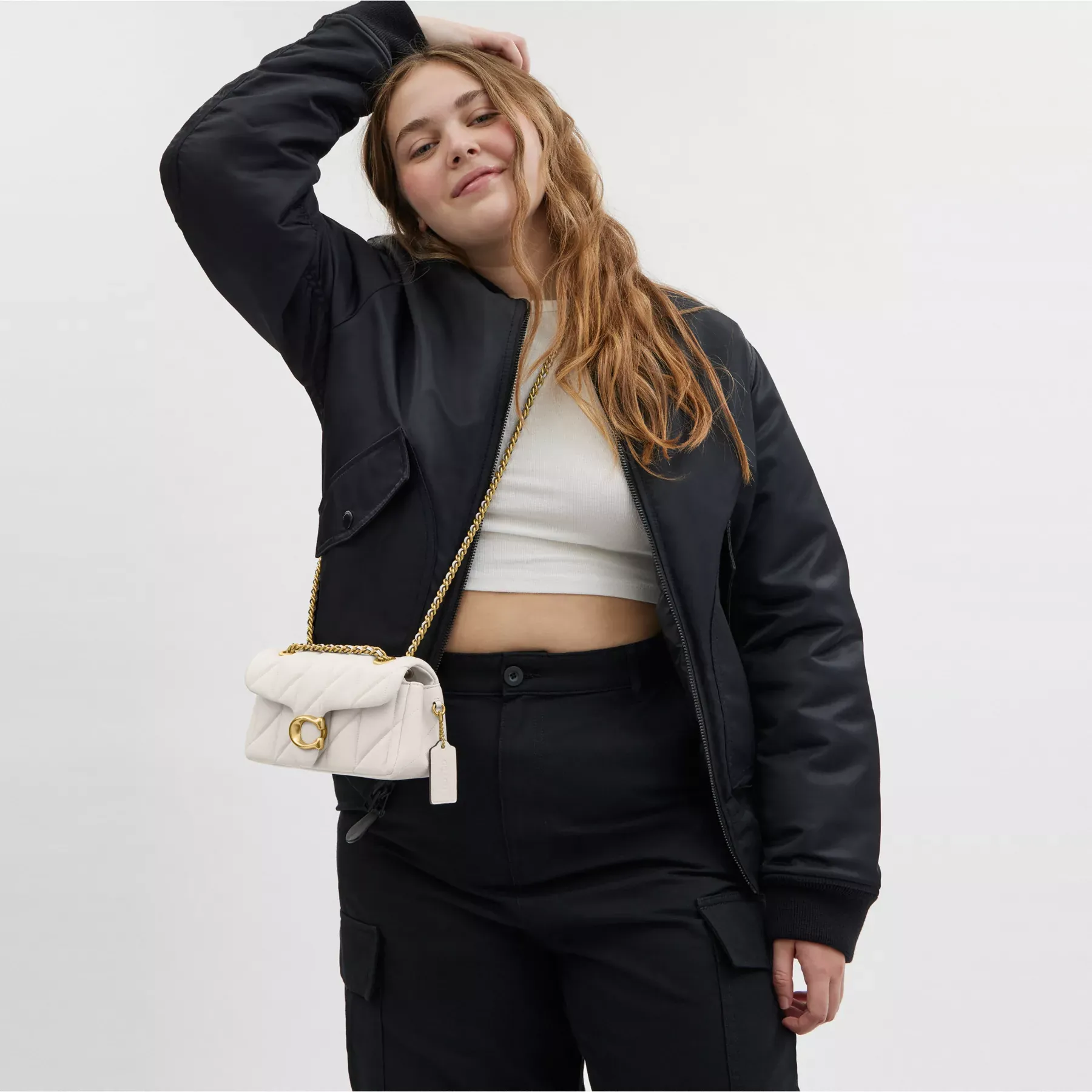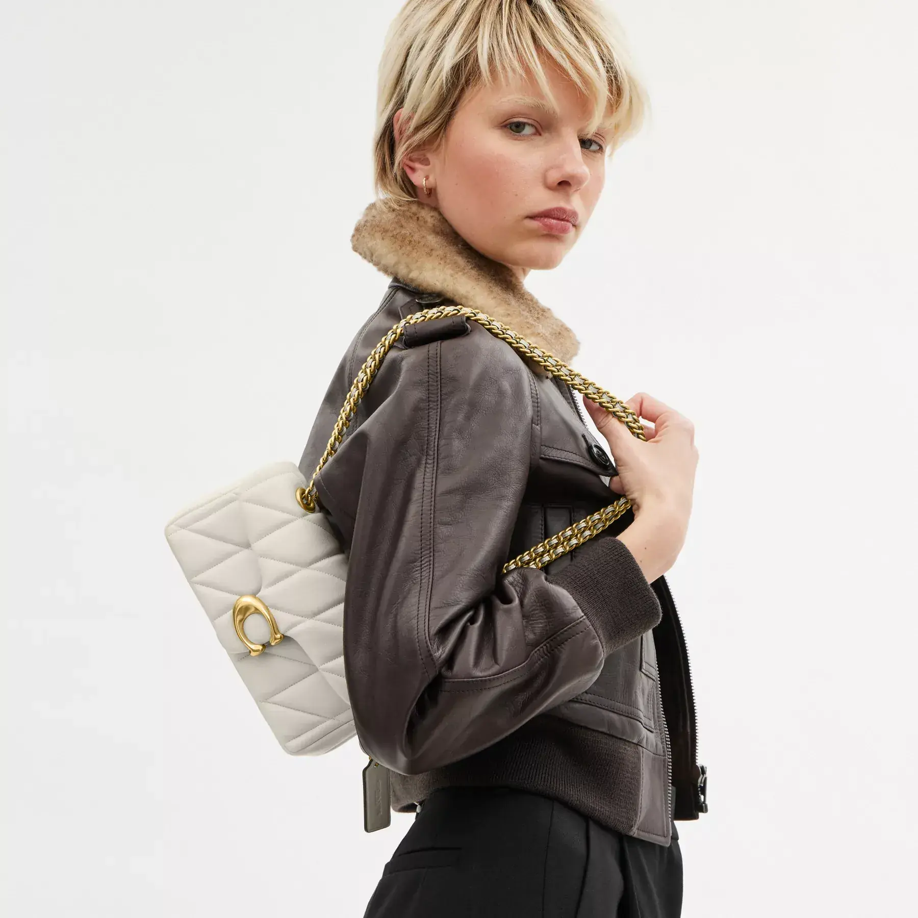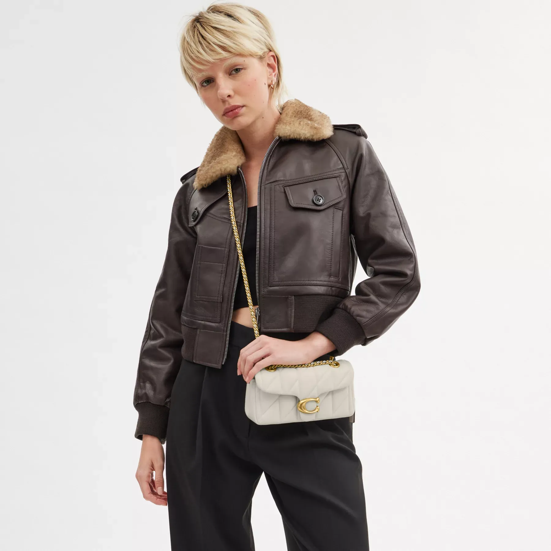 A modern take on an archival 1970s Coach design, our structured Tabby shoulder bag is crafted of quilted plush, ultra-soft nappa leather. Slightly smaller than the 26, the petite 20 features a long leather chain strap to wear crossbody or double up for a shorter, dressier look. It’s finished with our Signature hardware for an iconic touch.