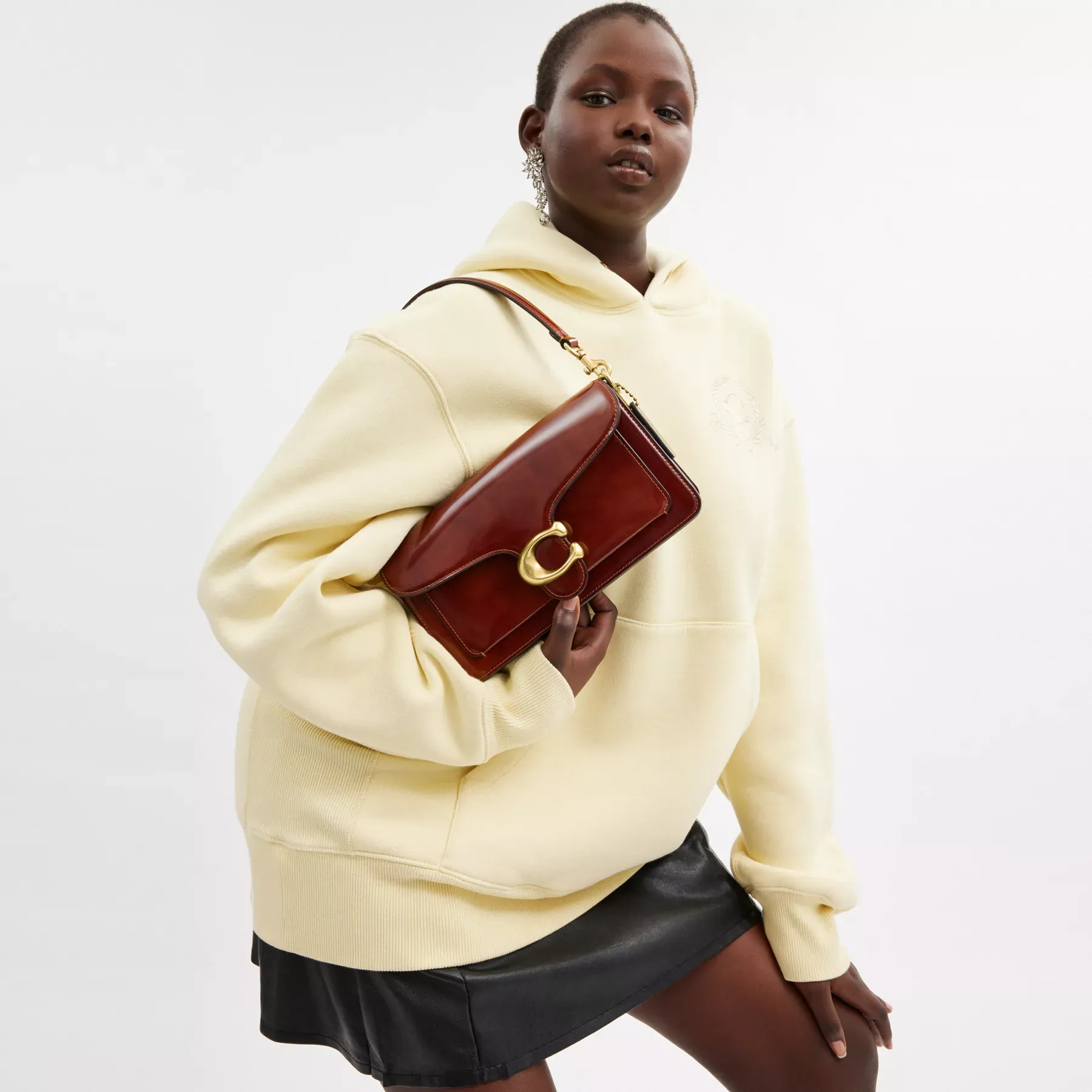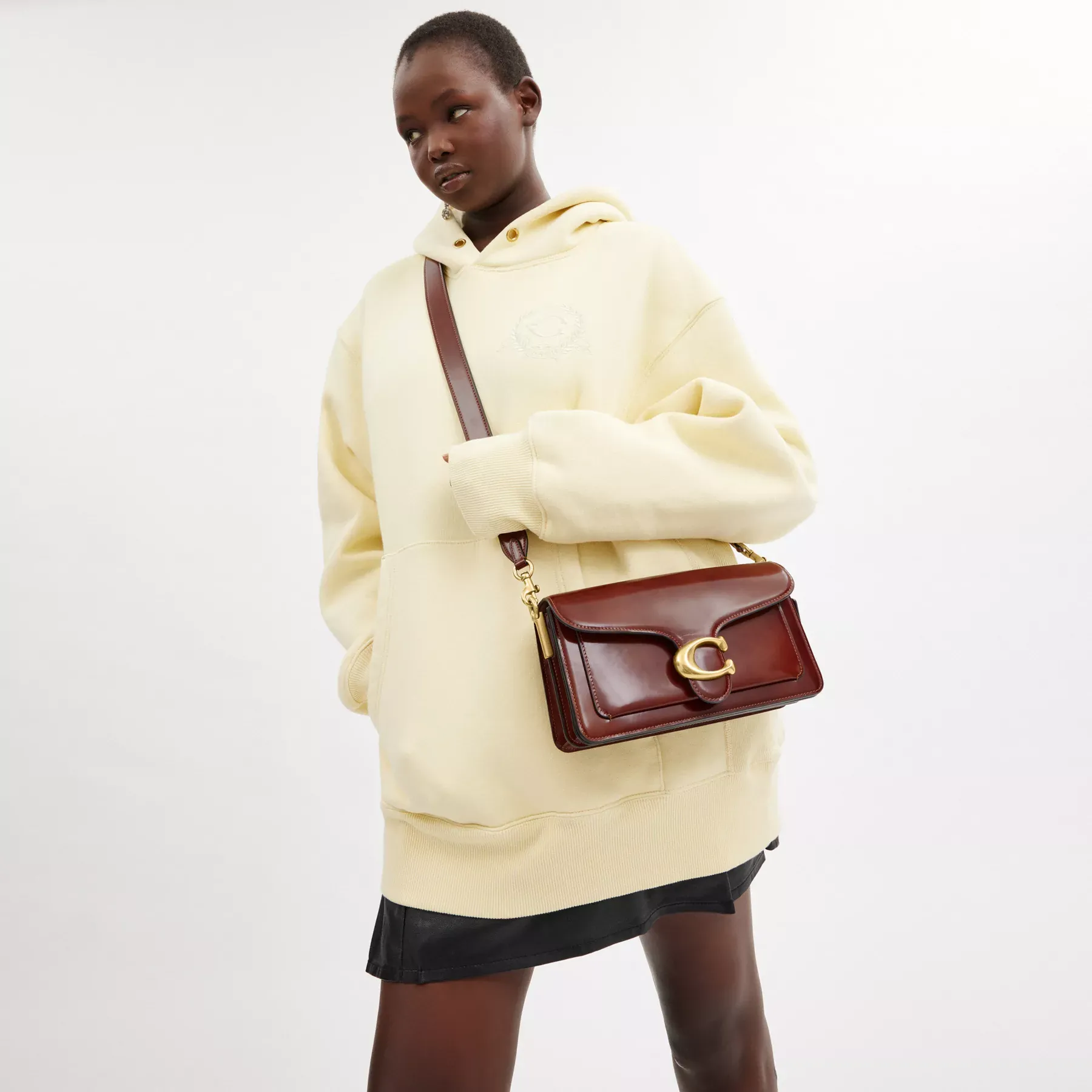 A modern take on an archival 1970s Coach design, our structured Tabby shoulder bag is crafted of lustrous smooth leather. Finished with our tonal leather-covered Signature hardware for an iconic touch, the compact 26 features two detachable straps to carry by hand, style as a short shoulder bag or wear crossbody.