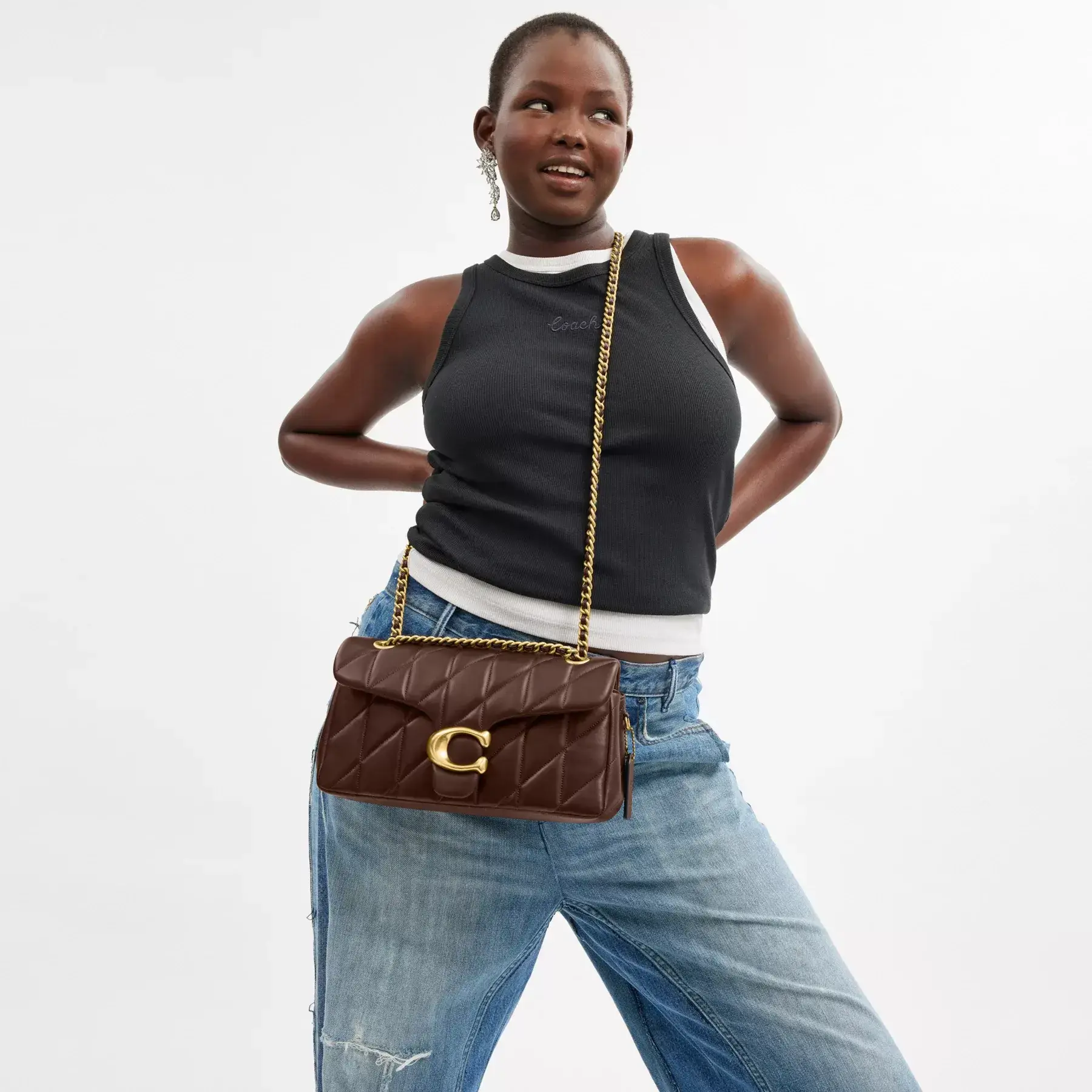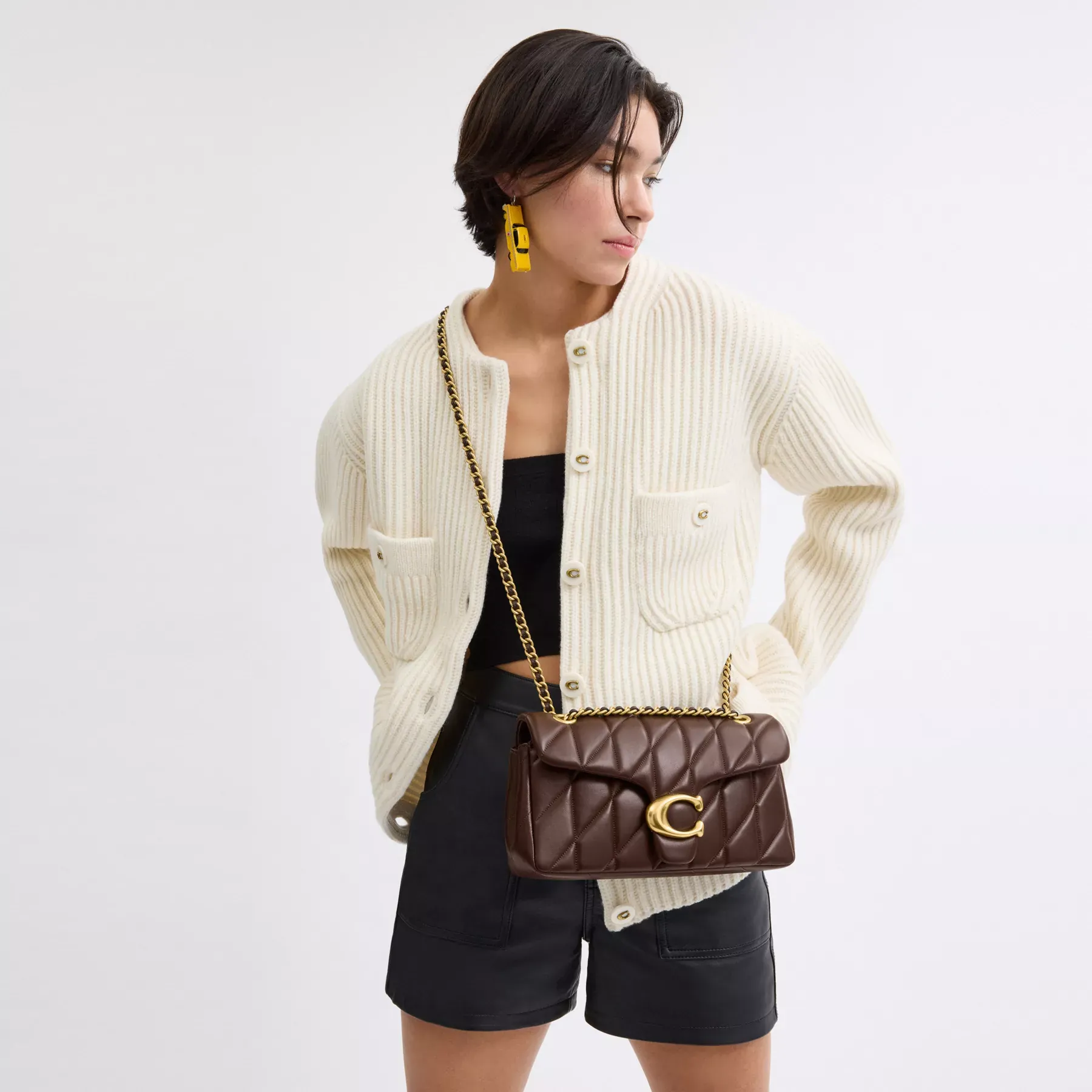 A modern take on an archival 1970s Coach design, our structured Tabby shoulder bag is crafted of quilted plush, ultra-soft nappa leather. Finished with our Signature hardware for an iconic touch, the compact 26 features a long leather chain strap to wear crossbody or double up for a shorter, dressier look.