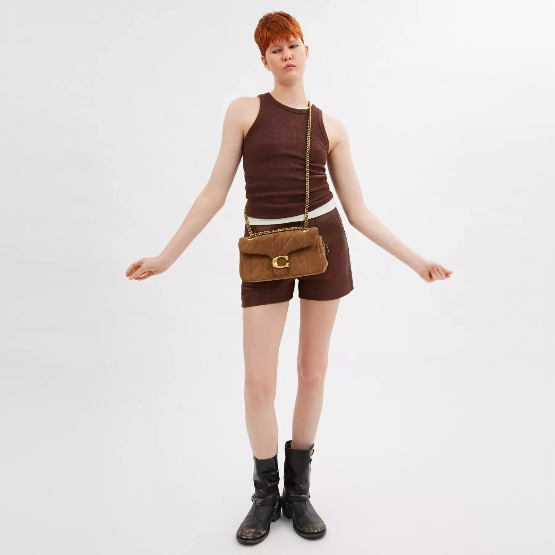 A modern take on an archival 1970s Coach design, our structured Tabby shoulder bag is crafted of quilted velvety suede. Finished with our Signature hardware for an iconic touch, the compact 26 features a long leather chain strap to wear crossbody or double up for a shorter, dressier look.