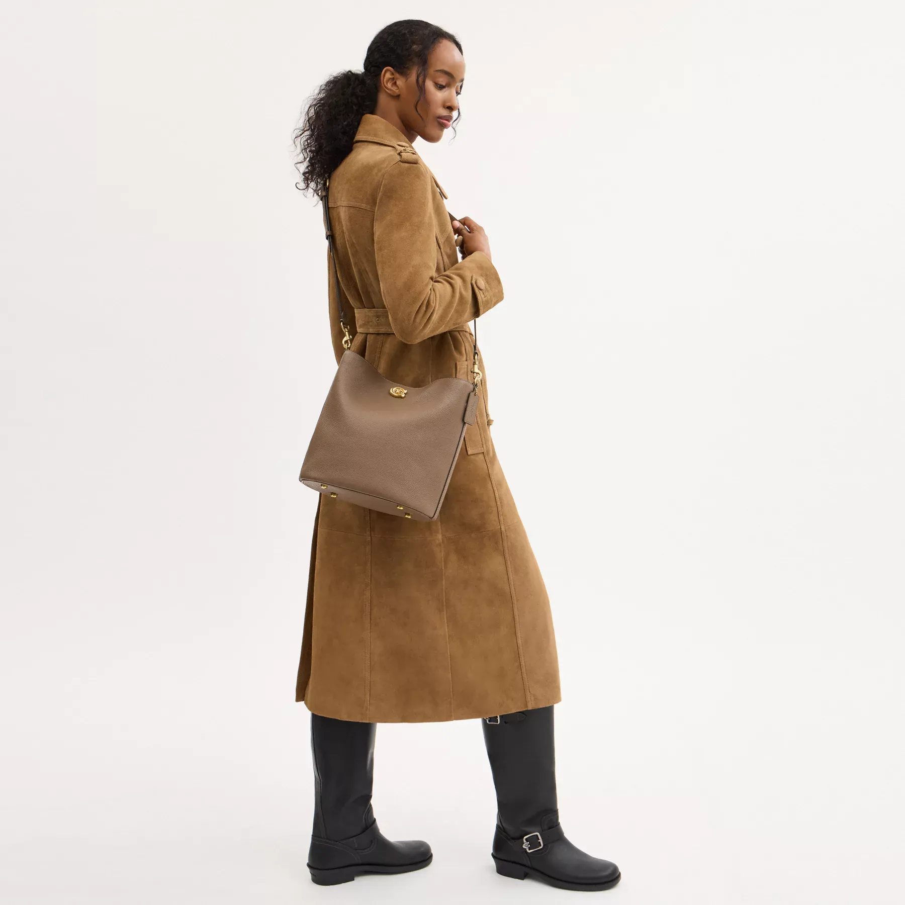 Not too big, not too small, Willow is the perfect go-anywhere shoulder bag with space for all of your day-to-day essentials. Crafted of polished pebble leather, the generously sized Soft Bucket Bag has an organized interior with one zip compartment, two open compartments and a pocket for small necessities. The streamlined bucket style secures with our Signature turnlock closure and can be carried by hand, on the shoulder or crossbody.